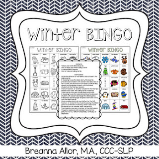 5) The final freebie that I have for you today is Winter Bingo, by Breanna Allor. It includes both black-and-white and colored boards and calling cards, and can be used to target a variety of speech and language skills! This freebie is a great way to incorporate winter themes into a fun and productive therapy activity.