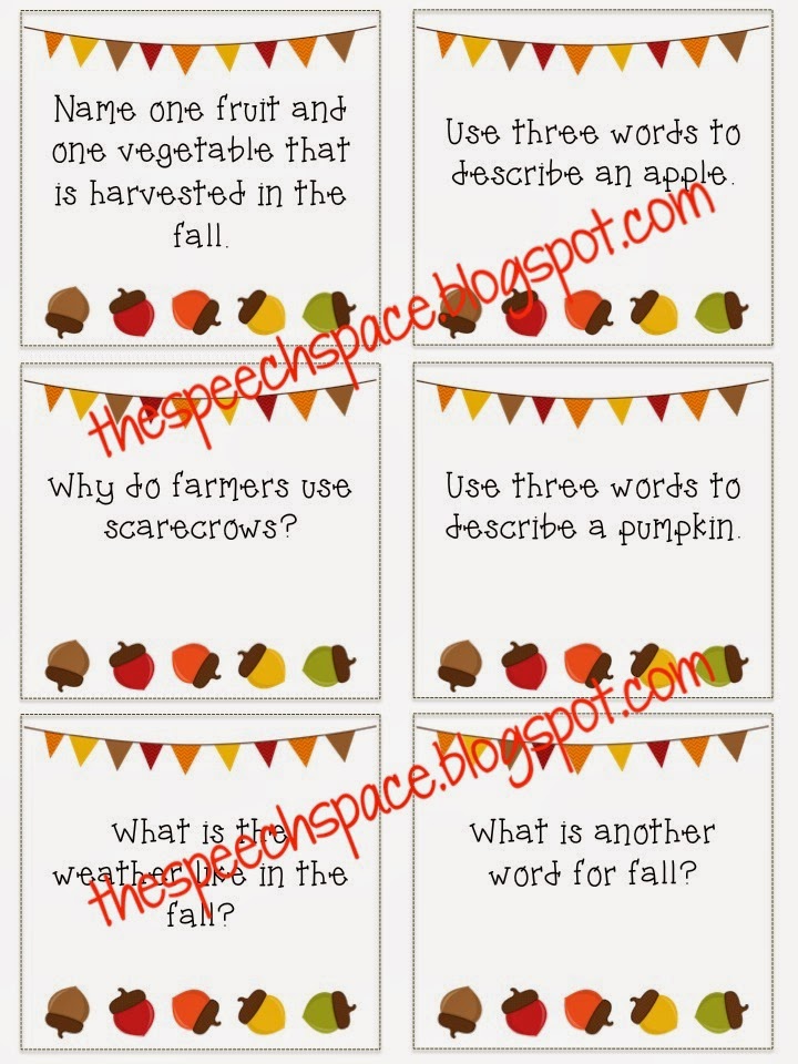 Then, there are 12 cute fall-themed cards that provide questions, topics, etc to facilitate expressive and receptive language skills. Here are some previews:
