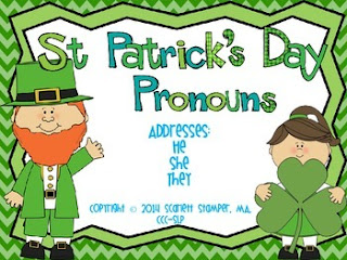 3) St. Patrick’s Day Pronouns, by Speech is Sweet, is a super-cute card game that targets “he”, “she”, and “they” in proper positions. This is a great activity for group therapy sessions. It will keep your students engaged, and the element of healthy competition is a great built-in reinforcer! Includes 30 playing cards.