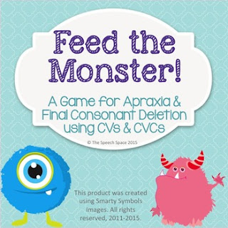 Next up is Feed the Monster! A Game for Apraxia & Final Consonant Deletion.  This is a fun and engaging way to work on speech and the kids absolutely love it!  This is part of my Apraxia & Phonological Disorder Survival Pack bundle, so if you’d like to get the best bang for your buck, I suggest checking that out first.
